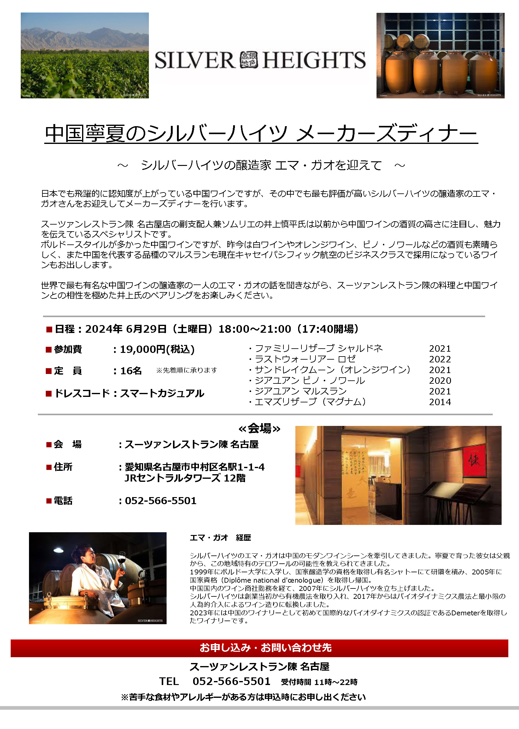 日本でも飛躍的に認知度が上がっている中国ワインですが、その中でも最も評価が高いシルバーハイツの醸造家のエマ・ガオさんをお迎えしてメーカーズディナーを行います。